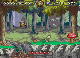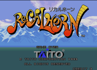 RECALHORN est un jeu de plateforme/action à scrolling multi-directionnel. Hormis les 2 actions de base inhérentes à ce type de jeu (attaque et saut), sa principale originalité tient à la 3ème, par laquelle le personnage principal peut faire appel à des animaux (lorsqu'il dispose du médaillon approprié) pour franchir plus facilement certaines zones du décor ou pour combattre plus efficacement certains ennemis. L'univers du jeu alterne forêts, zones sous marines et autres donjons. A noter que RECALHORN est proposé sous MAME sous le statut "prototype" car il n'a jamais été porté sur borne.