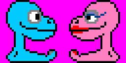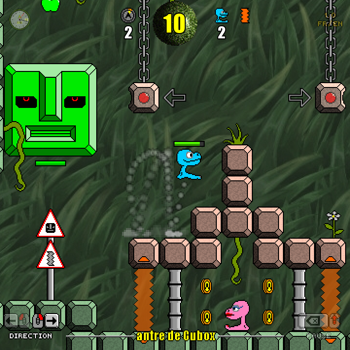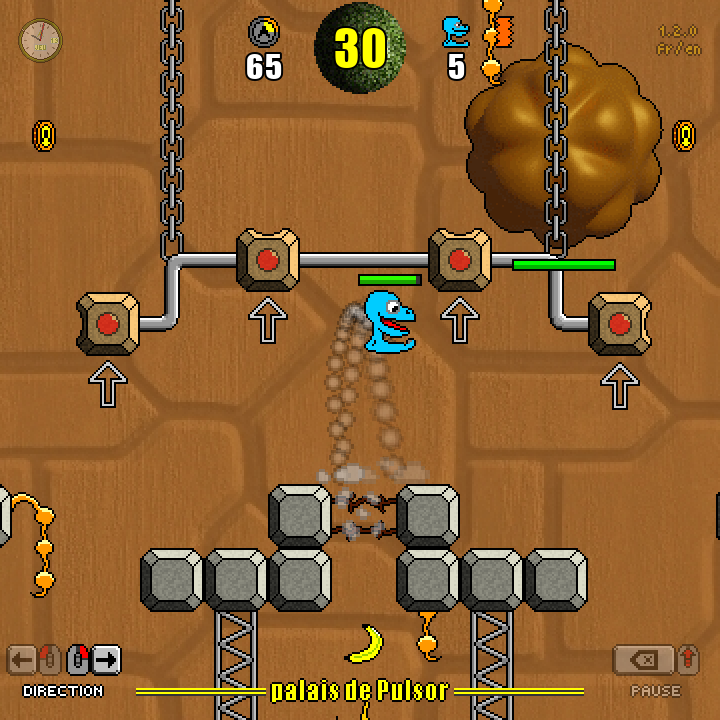 Fan inconditionnel de CRAFTON ET XUNK sur Amstrad CPC (mon premier ordinateur), je m'inspire initialement du personnage de Xunk (podocéphale animal de compagnie de Crafton, le personnage principal du jeu) pour créer Hop, une petite créature bleue ayant l'apparence d'une tête montée sur un pied unique. Souhaitant proposer une interface de commande la plus simple possible, je choisis de me limiter à 2 touches permettant de diriger Hop vers la gauche ou la droite, les sauts permanents du héros lui permettant de franchir la plupart des obstacles, d'atteindre des plateformes plus élevées ou de rejoindre un étage inférieur. En y ajoutant la prise en compte de l'élan et des rebonds contre les murs et le plafond, la formule de base est trouvée !