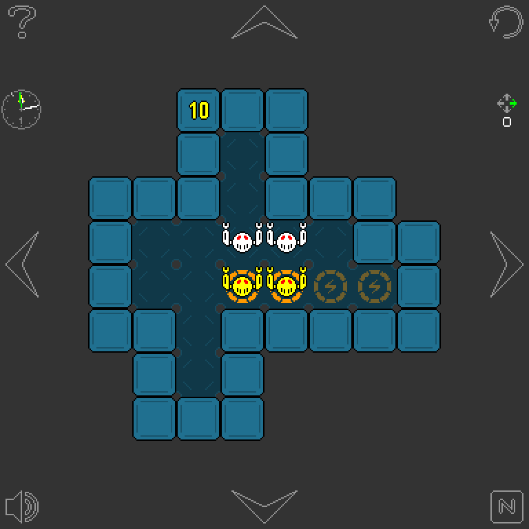 Guidez vos robots vers leurs stations de recharge en indiquant une direction à l'ensemble du groupe (gauche, droite, haut ou bas). Chaque robot suit la consigne en se déplaçant en ligne droite et ne s'arrête que s'il détecte un mur ou un autre robot. Un niveau est remporté lorsque tous les robots sont en charge.